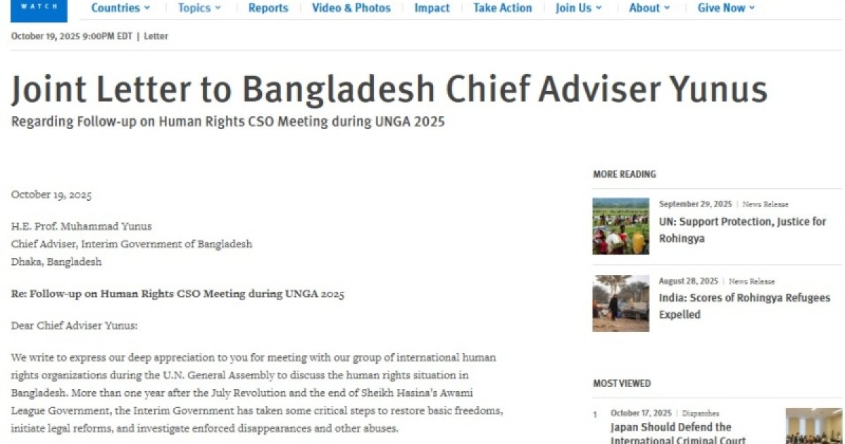 বাংলাদেশের অন্তবর্তী সরকারের প্রধান উপদেষ্টা অধ্যাপক ড. মুহাম্মদ ইউনূসকে চিঠি লিখেছে ছয়টি আন্তর্জাতিক মানবাধিকার সংস্থা। বাংলাদেশে মানবাধিকার সমুন্নত রাখতে সংস্কারপ্রক্রিয়া