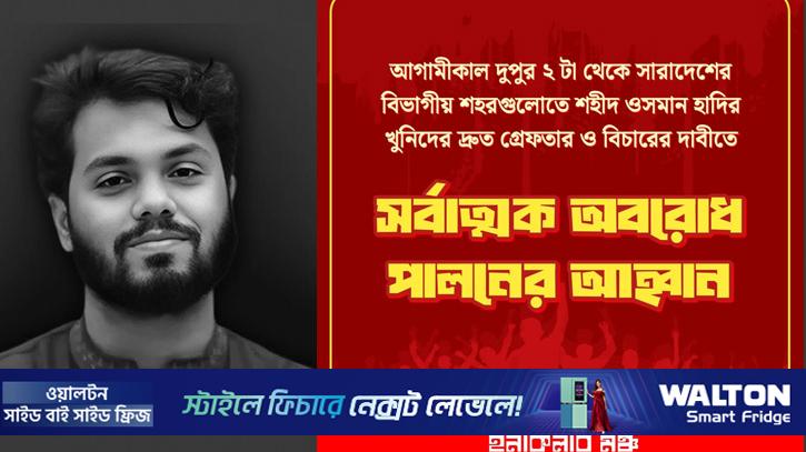প্রকাশিত: ০১:৪০, ২৮ ডিসেম্বর ২০২৫ শহীদ শরিফ ওসমান বিন হাদির খুনিদের গ্রেপ্তার ও বিচার দাবিতে সারা দেশে অবরোধের ডাক