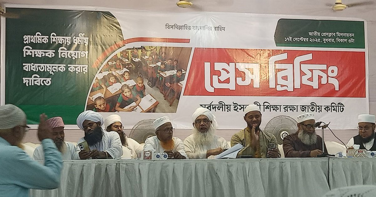 সরকারি প্রাথমিক বিদ্যালয়ে গানের শিক্ষক নিয়োগ বাতিল ও ধর্মীয় শিক্ষক নিয়োগ বাধ্যতামূলকসহ ৫ দাবি জানিয়েছে সর্বদলীয় ইসলামী শিক্ষা রক্ষা জাতীয়